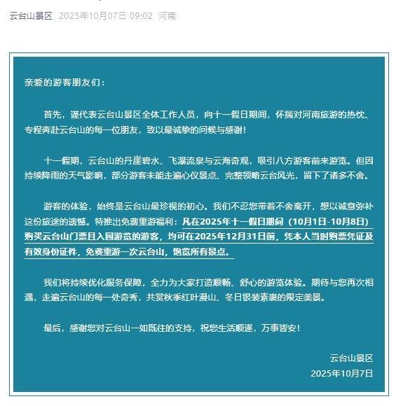 【大河财立方消息】10月7日,云台山景区发布公告,全文如下: