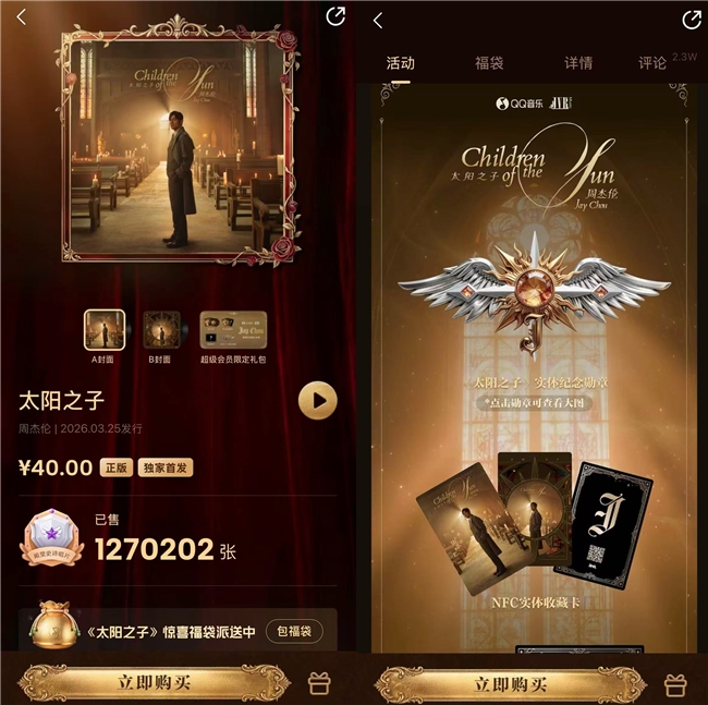 腾讯音乐独家首发周杰伦新专辑《太阳之子》,数字专辑销量已突破140万张网络2026-03-25 11:05